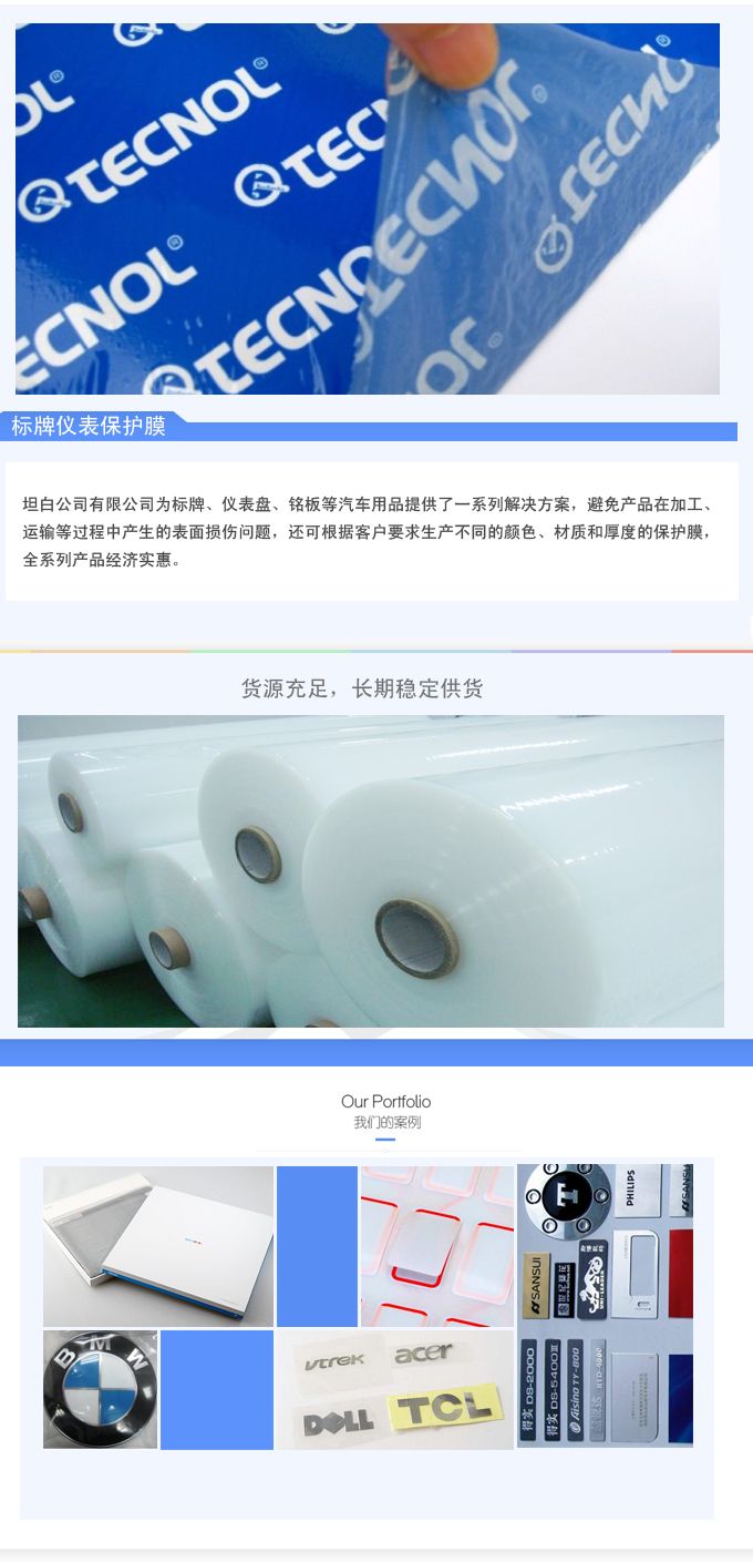 坦白膠帶有限公司為標牌、儀表盤、銘板等汽車用品提供了一系列解決方案,避免產(chǎn)品在加工、運輸?shù)冗^程中產(chǎn)生的表面損傷問題,還可根據(jù)客戶要求生產(chǎn)不同的顏色、材質(zhì)和厚度的保護膜,全系列產(chǎn)品經(jīng)濟實惠